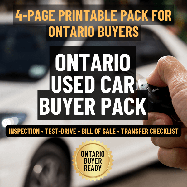 Each pack is a printable PDF designed to help drivers. The Emergency Kit includes 10 pages of checklists and reminders, while the Buyer Pack has 4 pages covering inspections, test-drives, a bill of sale, and ownership transfer.